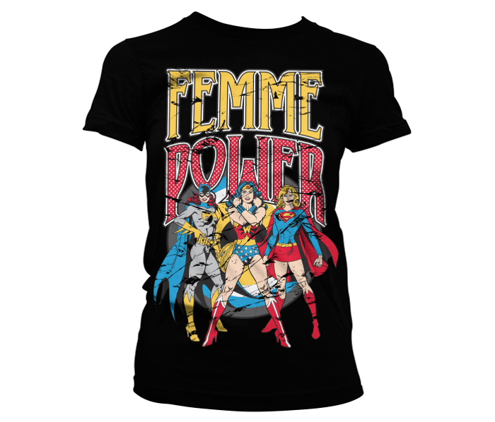 - grafika: Super Woman , Bat Woman i Wonder Woman jako Femme Power. Koszulka koloru czarnego