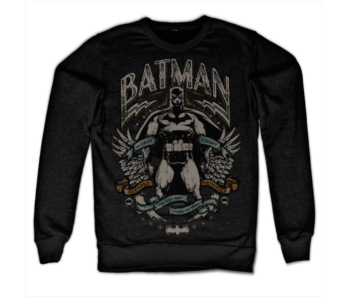 - grafika: Obraz przedstawia umięśnionego batmana z ptasimi skrzydłami zamiast dłoni . Przeszywa go wstęga z napisem The Dark Knight .